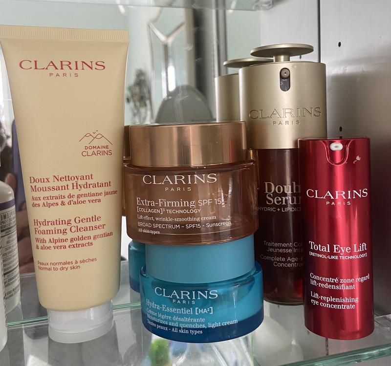 I have used clarins for years now and the new Extra-Firming day cream is my new favorite product !! I use one step gentle exfoliating cleanser along with the double serum and blue orchid oil and I get compliments on my complexion all the time and in my late 40s it always makes my day. thank you to the clarins team for constantly producing high quality products