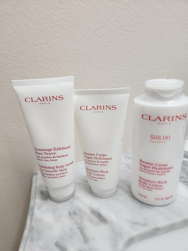 I have been using the Clarins moisture rich body lotion for several years. It is thick and very moisturizing but absorbs into the skin really well. I’ve gifted it to friends and family and they are all repeat customers. Also love the natural herbal scent. Definitely recommend this lotion!
