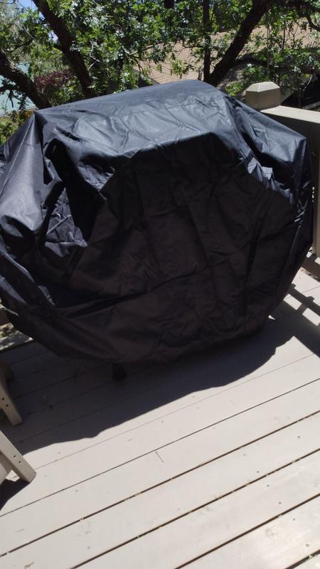 This grill cover met my expectations. We invested a lot of money in our grill, so protecting it from the weather is a top priority. This cover keeps our grill covered and dry and the bungees keep the cover secure. It stayed put during out last wind and rain storm. It seems to be made from a good quality material that will hold up for a long time. It was a nice added bonus that it came with a grill light and grill brush. These both are very handy and useful as well.