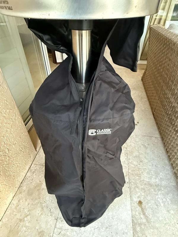 This cover is sturdy and looks great on my heater- I love that it has both a zipper and Velcro to close for a secure fit. Water resistant and looks great with the black fabric, gives me piece of mind for the winter months. We use our heater through November then not again till May so this cover is the perfect addition to our patio to keep the heater safe and dry. The black fabric matches our umbrella covers as well so our patio looks coordinated all winter! Love it!