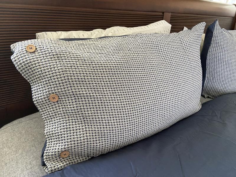 Mara Yarn Dyed Cotton Bamboo Blend Duvet Cover Set is casual and comfy with soft waffle weave texture that fits perfectly in my farmhouse style bedroom. Charming large button closures and I love that the cotton bamboo blend material is made with OEKO-TEX certified organic cotton which means no chemicals. One side of the duvet is waffle texture and the other is plain cotton material in solid taupe. I am very happy to find a quality duvet set that is oversized (92” x 94”) which makes it so much easier to fit on my overstuffed queen insert. Yes this cover has the interior corner ties to keep my duvet in place and the set includes two pillow shams. Love it!