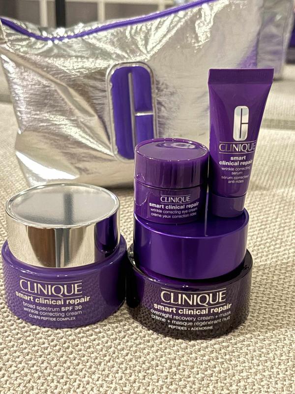This is a nice, comprehensive set of products. It includes really everything you need for a solid daytime and nighttime routine. I don’t typically wear sunscreen every day so was apprehensive about using the moisturizer with SPF. I ended up being very impressed with it however! It was not greasy or heavy feeling and it absorbed quickly without the typical sunscreen residue. I found that the eye cream also absorbed nicely and felt light on the eye area, but also tightened up the area the way you’d expect an anti-wrinkle formula to work. The night cream is also great. It has a thicker texture (you can also layer it on as a face mask), but it didn’t feel heavy. My skin looked noticeably brighter and firmer in the mornings. The only piece of this set that I didn’t love was the serum. I used it for about 2 weeks but didn’t notice any significant results or changes to the fine lines on my most problematic area. I received this product for free from Clinique for testing and review purposes.