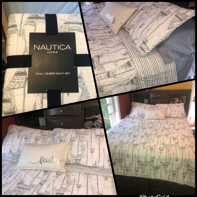 I can’t count how many quilts/comforters we’ve been through this year Nautica Clipper Grey Full/Queen Quilt-Sham Set! Nothing has been comfortable enough, good quality or even as nice looking in person as it is in pictures. When the Nautica Clipper Grey Full/Queen Quilt-Sham Set arrived I liked what seen. I opened up the package and put the set on the bed, I loved the quality and design. When we slept in this set we knew this was the one for us! This set is gorgeous and the right thickness we wanted for warmer weather. It was so relaxing and comfy! The Nautica Clipper Grey Full/Queen Quilt-Sham Set is my happy place and so nice to wash! The color blends well with many color schemes! Very happy!!I