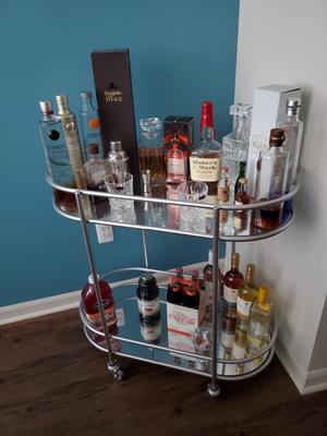 Art Deco glamour and elegance, this gorgeous bar cart combines both with its mirrored tops and shimmering silver-tone frame while casters provide for easy mobility making entertaining a breeze.