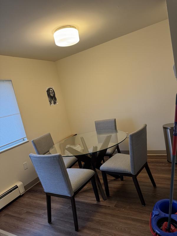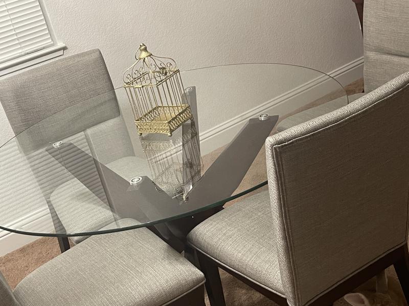 I bought this dining table in February 2021 for a 1 bedroom condo that my mom lives in for a few months each year. There was always a tablecloth on it because she hates fingerprints. One night in February 2024 she went to sleep and heard a loud noise. She thought it was a gun shot but saw that the table basically exploded…. Shattered glass all over the living room. Thank goodness she wasn’t sitting there otherwise she would’ve been severely injured. She spent days getting the glass out of the chairs and rug, and still to this day, a piece will catch her eye or cut her finger. I normally don’t write reviews but thought it could save someone lots of trouble.