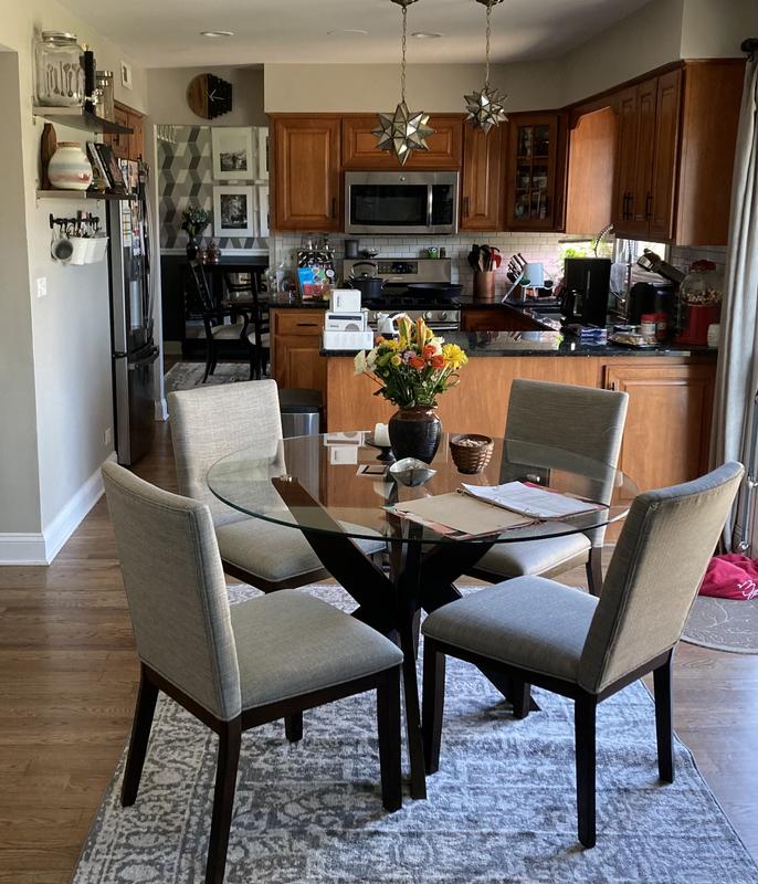 The table is beautiful and fits perfectly in my kitchen. Beware, delivery is contracted out to local companies. My 5-star delivery was a 3-star experience. 1 chair arrived broken and took 3 weeks to get it replaced, No white gloves or covered shoes. The guys were very nice, but it was just a regular warehouse delivery. Not worth what I paid for white glove service