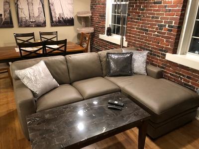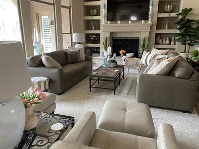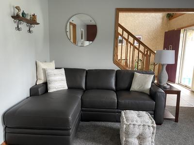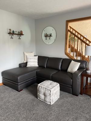 Love it! Can use it to create a chaise when it’s next to the couch or I put it between the loveseat/couch and we both can put our feet up on it and still have room for a tray with drinks/snacks. My three pieces are taupe and I love it because it goes with anything! I can change out throw pillows for a totally different look. The leather is divine and holds it shape even tho it is not “stiff”.