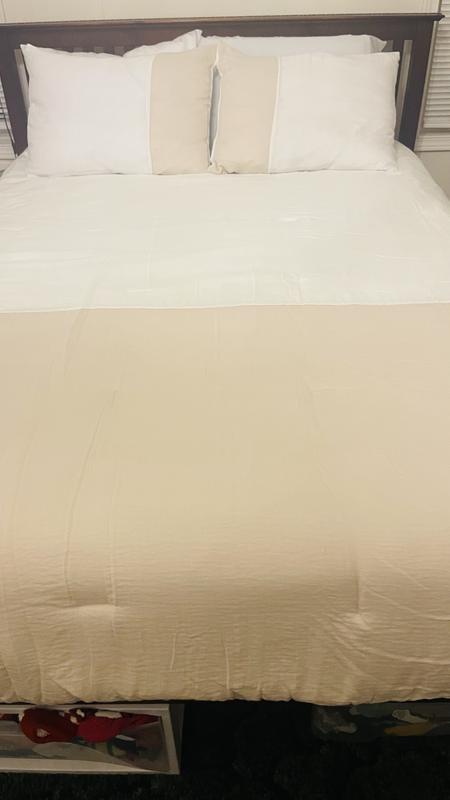 The neutral colors are perfect for either my son or daughter. The comforter is a nice high quality material and stuffing. Matching throw pillow cases make this 3 piece set come together nicely. It fits a little large over a full but works well.