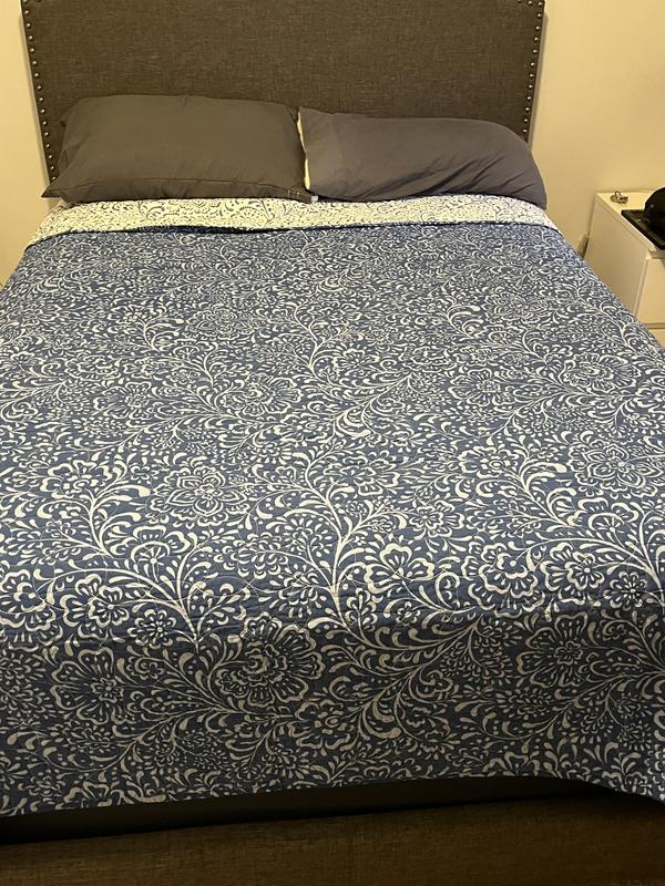 This quilt is an ideal covering for warm summer nights. I use a matching blue blanket if more warmth is needed. The quilt is reversible and the patterns are very pretty; however, the color is more navy than powder blue as shown in the picture. It washed well and I would definitely buy it again.