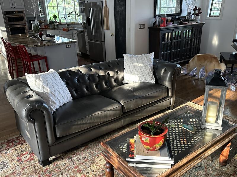 The closest Macys is 60 miles away, so it wasca leap of faith to purchase the Chesterfield couch, loveseat, chair and ottoman without having a chance to try them out in the store first. I am absolutely thrilled with the quality of the furniture and beauty of the leather. I also love the firmness of the cushions and the depth of the seats, which allow you to sit up straight, instead of slouching like so much furniture made today. The quality of these pieces will allow them to be used in our den for decades.
