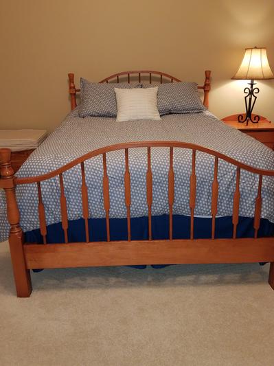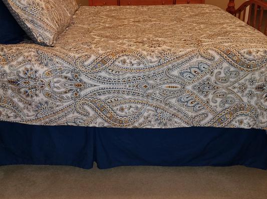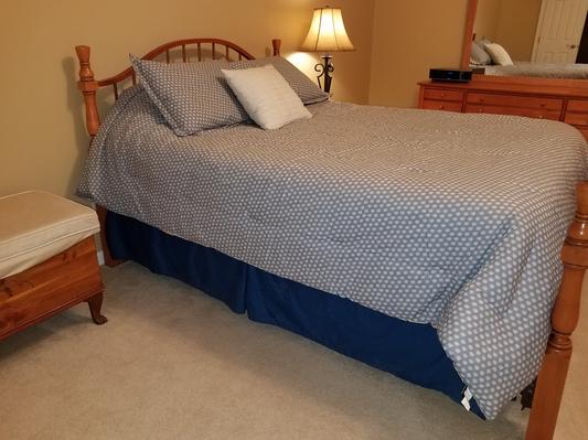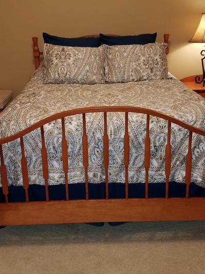 Very pretty and fits our queen size bed nicely. Love that it is reversible. Both patterns are very nice, just wish the underside(blue side) was a little softer.