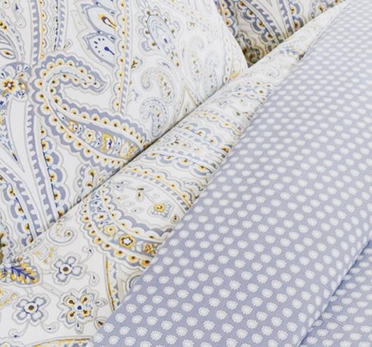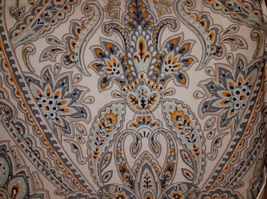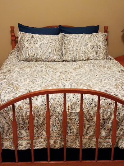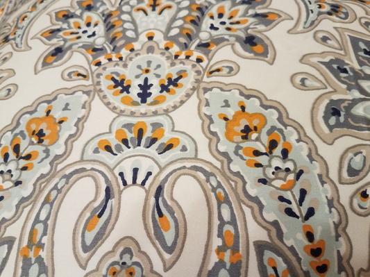 I really love this bedspread, it’s a nice weight and very soft. The pattern has a pale and vibrant blues, greys, and marigold that go together quite nicely. The reverse has a nice muted pattern as well. Definitely a great addition to any bedroom.