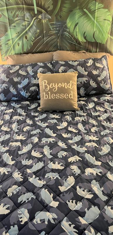 The past week, I have been using my new Eddie Bauer Camp Camo Quilt/Sham Set and absolutely love it. As a young adult, I can honestly say this quilt set is not just for children. The vibrant navy blue pops and the bear design all over makes it even cuter. Also, I found as the seasons start to change the blanket works really well to keep you warm, without overheating. It's very lightweight, easy to carry, soft and you can bring it anywhere. My friends and family have already been giving me a ton of compliments, so I would highly recommend this set.