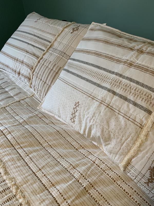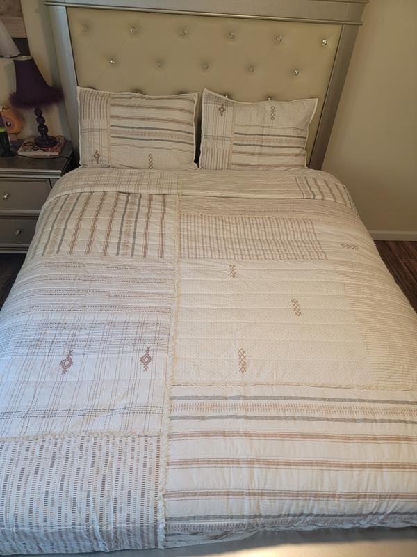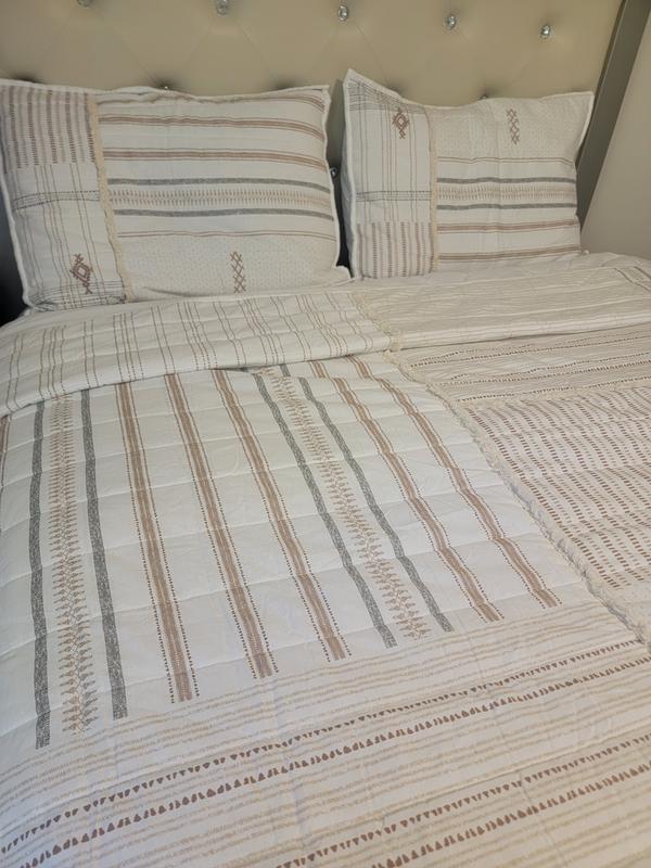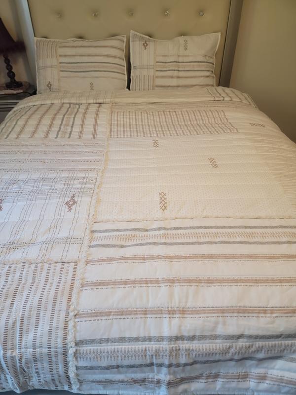 This set brightened up one of my guest bedrooms. The colors are very neutral and warming. I love that the set is 100% Cotton and machine washable. Pictures are attached so you can see the trim and detail of the set.