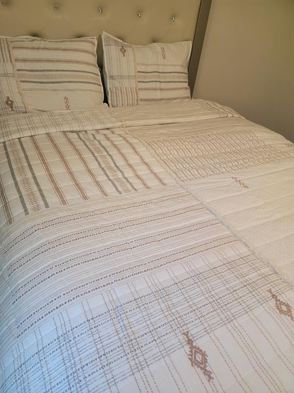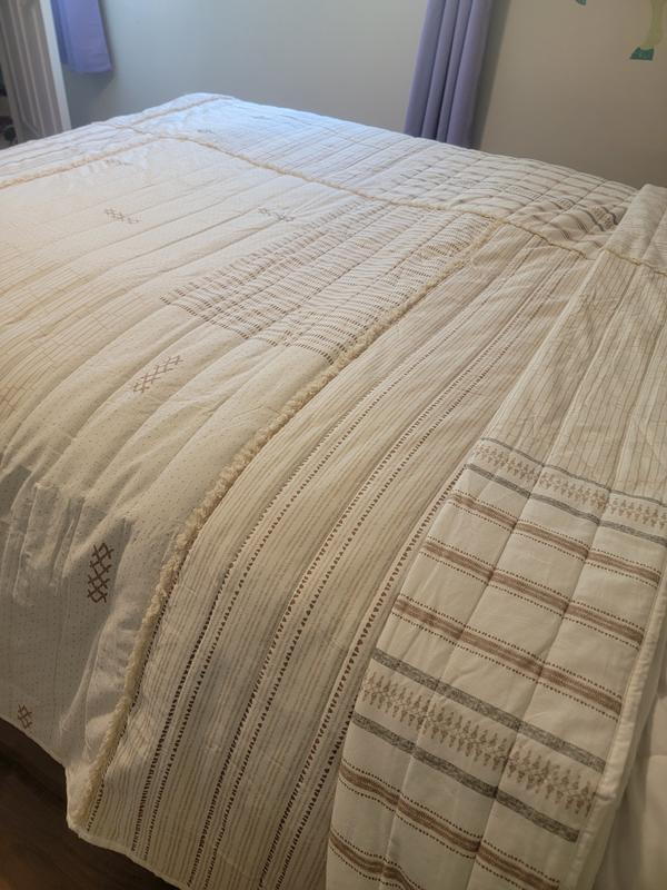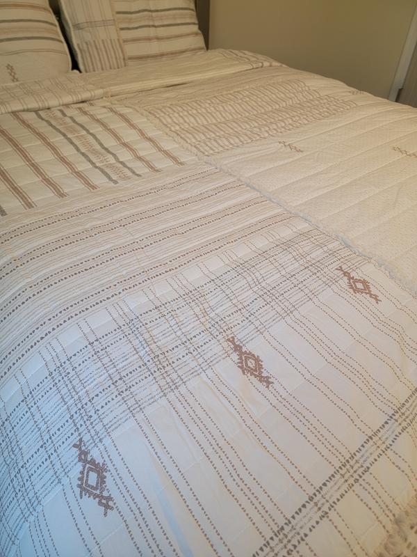 When it comes to bedding, I love cotton, and this coverlet is perfect for my son's room. It's made out of cotton, so it's warm and breathable at the same time, and it only gets softer with each wash. The design is lovely, with soft neutral colors, and it looks so nice when the bed is made. The quality is excellent, and it's perfect to use on these colder fall nights or any time of the year really. You can't go wrong with cotton, and this coverlet is a favorite!