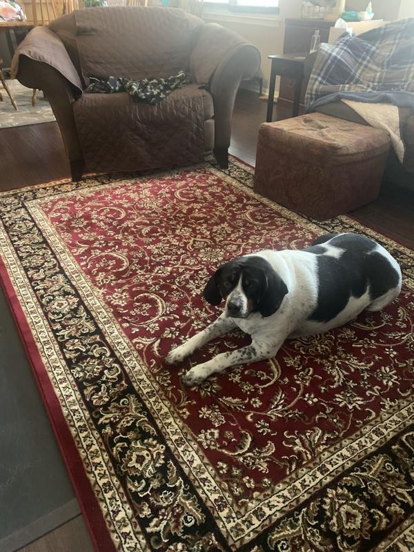Love this area rug. The colors are beautiful and the design is traditional. It is bigger than I expected. Fast delivery.