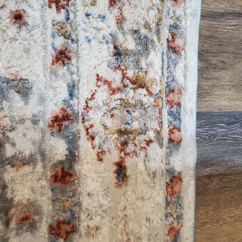 My revuew for the Loloi II Estelle, IVORY / RUST RUG...is that it is well made, ive gad this on the floor with heavy traffic for over a month and so far it had held up pretty good. No loose ends or tears. The design does say rust but its more old fashion design than the rust look. It also doesnt have good floor grip so i ended up getting rug double sides tape.