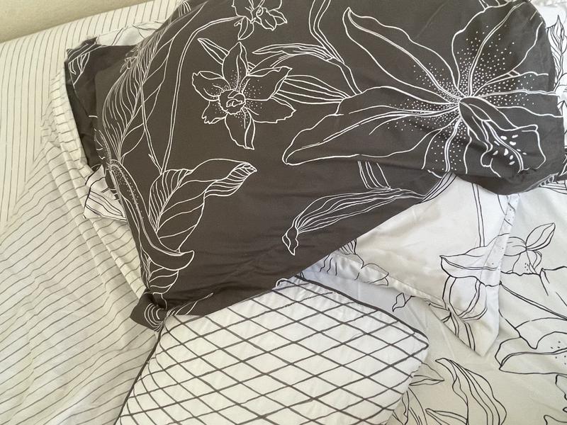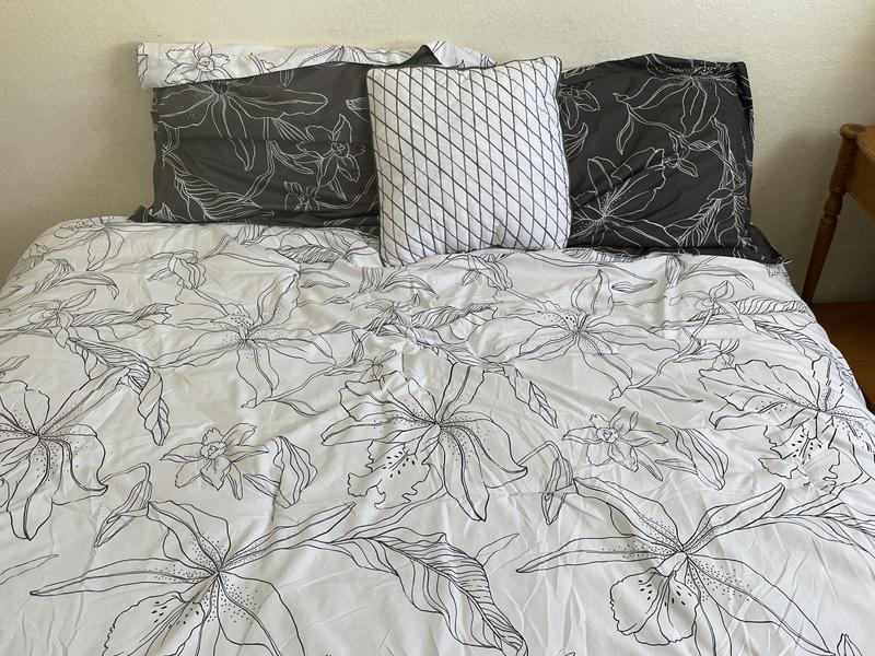 This comfortable set is gorgeous with the crisp white and deep black contrast. The large floral design makes it so elegant looking even on my simple metal frames bed. The white sheets with soft grey lines are nice and fit a medium depth mattress. I would say the only thing I would change is have the fitted sheet a touch bigger for thick mattresses with covers.The fitted sheet never fell off even after the roughest of sleeps but it would pull to one side of the mattress. There are quite a few designs and choices for their bed in a bags and I will definitely be grabbing a few more styles as they are made really well, and handle a lot of washing without dulling. I almost forget the pillow covers fit large pillows so nicely and you dont have to fight to get them on. Highly recommend!!