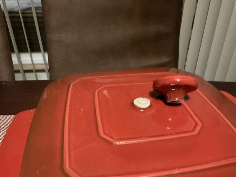 I have the rectangle dish, the lid just cracked in half after coming out of oven. My husband tried to glue together, you can see the line hopefully. The color changed when git hot so don’t think it’s good for oven. Temperature was only on 375 for 30 minutes