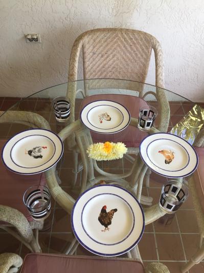 This delightful set of porcelain salad plates mix country charm and usability well! A nice size and a fairly deep well on these plates allows for a generous salad portion and assurance the dressing stays "on" the salad, not in your lap! Love the variety of poultry prints included. Clean p easily in the dishwasher with no color fading, or etching. These look great on my table and on my plate shelf in my Amish cupboard. Would also make a nice gift!