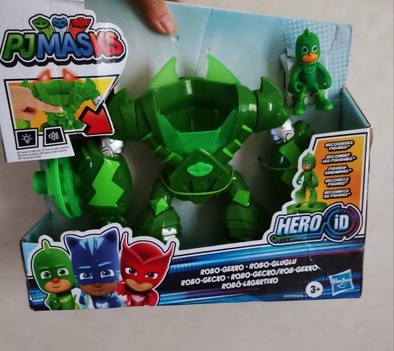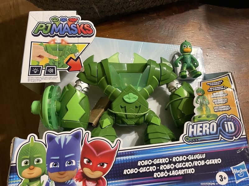 Preschoolers can power up playtime with the PJ Masks Robo-Gekko toy! Gekko's battle-ready robo suit is equipped with amazing Hasbro Hero Identity technology that recognizes and reacts to Hero ID-compatible PJ Masks action figures with hero or villain-themed lights and sounds.