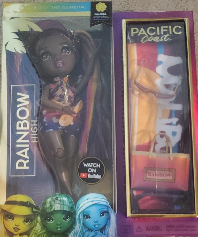 The Rainbow High Pacific Coast Fashion Doll is an excellent addition to my daughters doll collection. I love the rich skin tone with the multi color hair and the trendy wardrobe. The Rainbow High Pacific Coast Fashion Doll comes with sunglasses, visor and a doll stand and a few additional accessories. I will definitely purchase more dolls from the collection because of the gorgeous high quality, interchangeable outfits and accessories. I highly recommend the Rainbow High Pacific Coast Fashion Dolls.