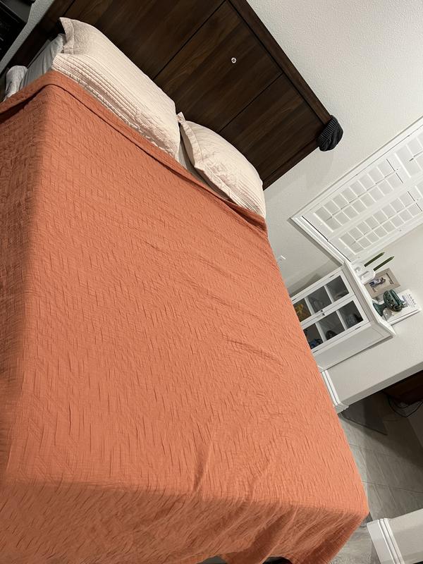 I got this blanket as part of new product review. I am so well pleased of its fabric color and texture. I’m a OCD, bothered by wrinkles on bedsheets. This fabric’s texture doesn’t bother me knowing it’s the design. Comfort wise, it provides moderate warmth during winter time (In Missouri) given its light-weightiness. So adding this over a flat sheet provides enough warmth.