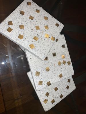 A beautiful way to protect tabletops from messy drips, this set of 4 coasters is made from terrazzo that is flecked with bits of gold brass for an unexpected sparkle