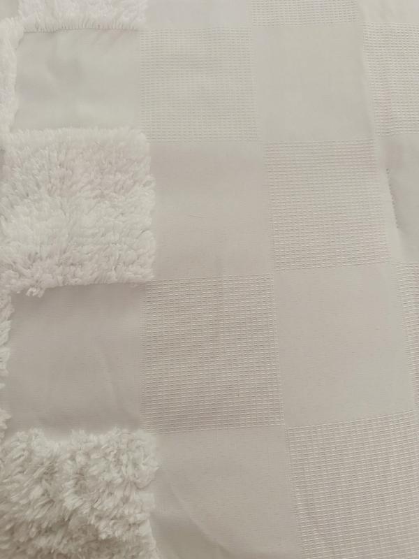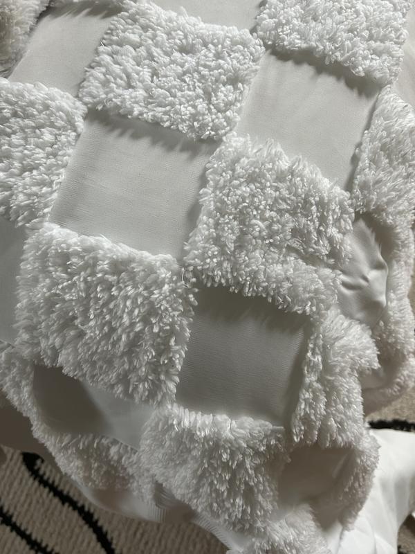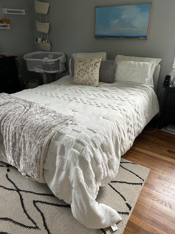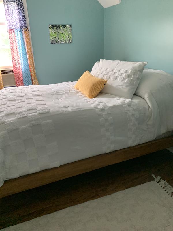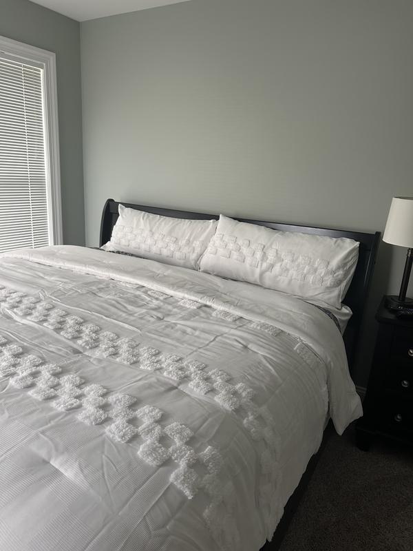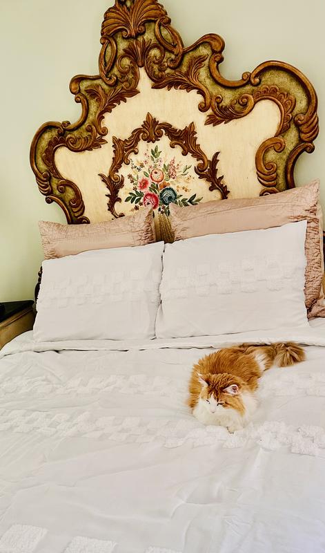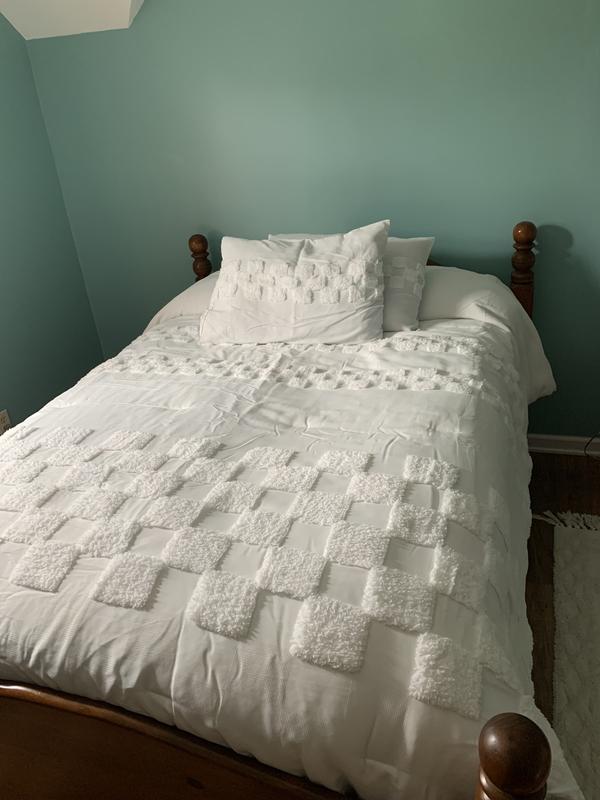 I have an old, painted bed frame that I love very much. Because it’s already so ornate, I prefer to use a white comforter. I also happen to love the look of white sheets with a fluffy white bedspread and pillows! When I saw this gorgeous 3 piece comforter/pillowcase set, I knew I had to have it for my bed. I took it home and washed it, then immediately put it on my bed. I love it! The details are more subtle from a distance but up close, they are really nice without being over the top. The checkerboard chenille pattern is soft and pretty. The pattern is somehow both contemporary and classic at the same time. The set updates my old bed frame in such a nice way. The comforter is soft and fluffy and keeps me just the right temperature while I’m sleeping - not too hot and not too cold. The pillowcases are envelope style so my pillows don’t slide out - a very thoughtful detail! The comforter set also washes well and fits just fine in my standard size washer and dryer. And, as you can see, my cat also loves the comforter and thinks it’s there just for her!