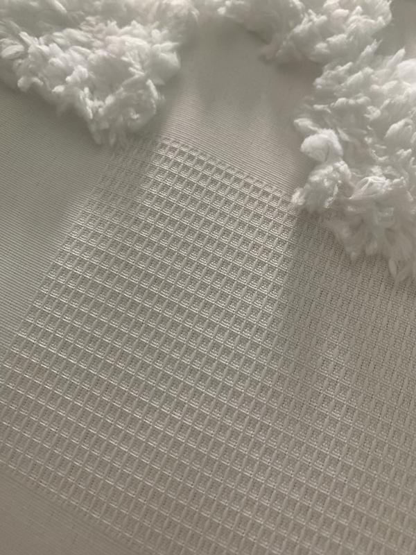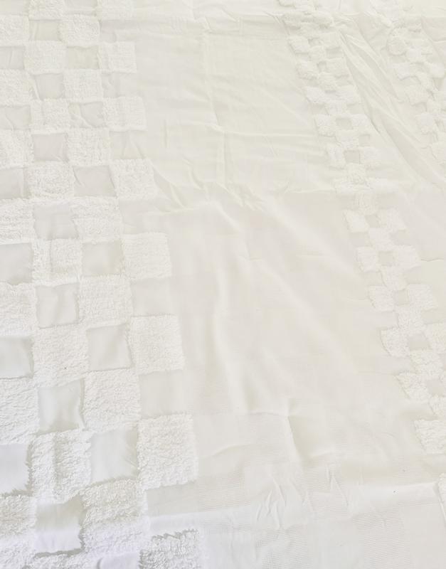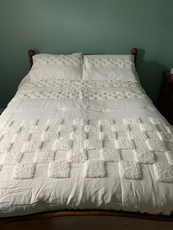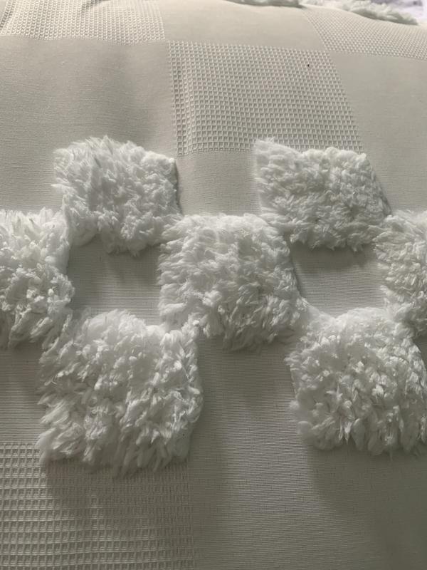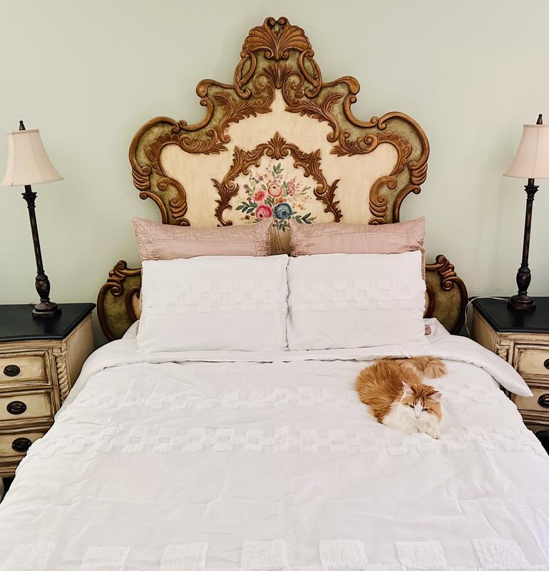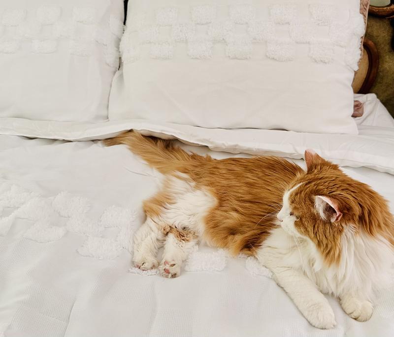 I have an old, painted bed frame that I love very much. Because it’s already so ornate, I prefer to use a white comforter. I also happen to love the look of white sheets with a fluffy white bedspread and pillows! When I saw this gorgeous 3 piece comforter/pillowcase set, I knew I had to have it for my bed. I took it home and washed it, then immediately put it on my bed. I love it! The details are more subtle from a distance but up close, they are really nice without being over the top. The checkerboard chenille pattern is soft and pretty. The pattern is somehow both contemporary and classic at the same time. The set updates my old bed frame in such a nice way. The comforter is soft and fluffy and keeps me just the right temperature while I’m sleeping - not too hot and not too cold. The pillowcases are envelope style so my pillows don’t slide out - a very thoughtful detail! The comforter set also washes well and fits just fine in my standard size washer and dryer. And, as you can see, my cat also loves the comforter and thinks it’s there just for her!