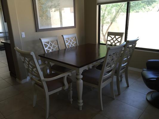 Have dining room table and 6 chairs. Also purchased the buffet to match. The buffet arrived and was a completely different color from the dining room set. There was also a large crack in one of the table legs . Contacted customer service and its been over 2 months and they haven't replaced the cracked part yet. This is not quality furniture.