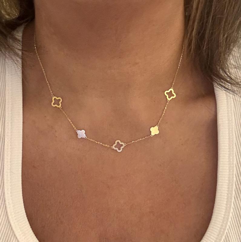 This necklace is even prettier in person. The way the light reflects off the gold enhances its beauty. The cloverleaf’s are the perfect size and noticeable. This is one of my favorite pieces and am so pleased I purchased it.