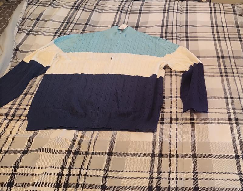 Very nice zip up sweater. And I like the colors of the sweater too. It looks real nice.