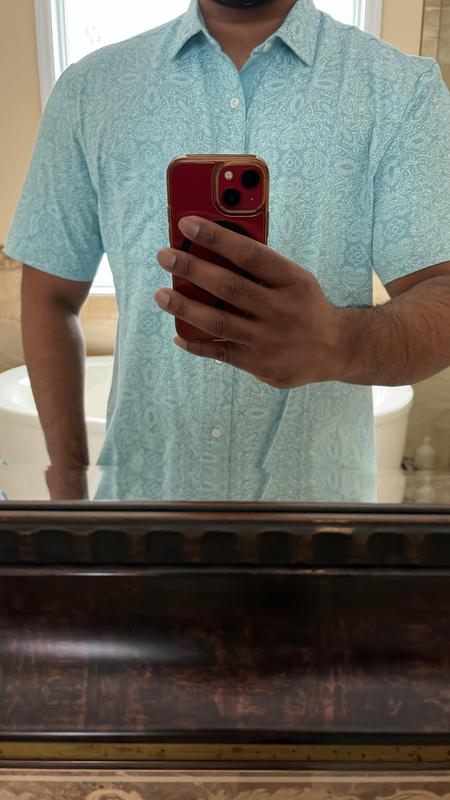 This is a fun, trendy shirt for men to wear in the summer. It’s soft and made of 100% cotton and is light weight. The beige, tan & white colors have a nice paisley type pattern throughout the shirt. I also love the solid color inside the button panel! You can’t go wrong with this shirt, perfect for casual or semi dressy.