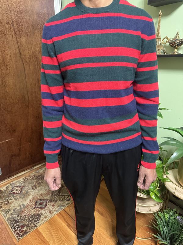 This sweater has really bright red colors with a nice shade of blue. I like the fact that it is super light, but also super super thin thin thin. I got the large size and it fits very snug I hope it does not shrink to much other wise it won't fit. I will have to dry clean it for that matter. As far as being cashmere??? I guess it does feels somewhat soft not like an angora sweater with long fiber hair. I will be able to wear just a white Tee shirt under it and not get over heated while at a party or restaurant.