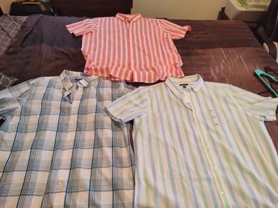 My husband recently had a neck fusion. He normally wears pullover shirts. Therefore he can not raise his arms yet. It is an orange sherbet color. He has gotten many compliments. He liked it so much we bought 2 more. He says it feels lightweight and cooler to wear