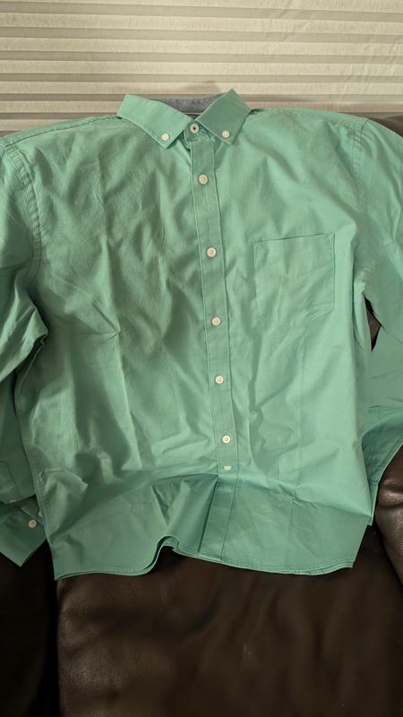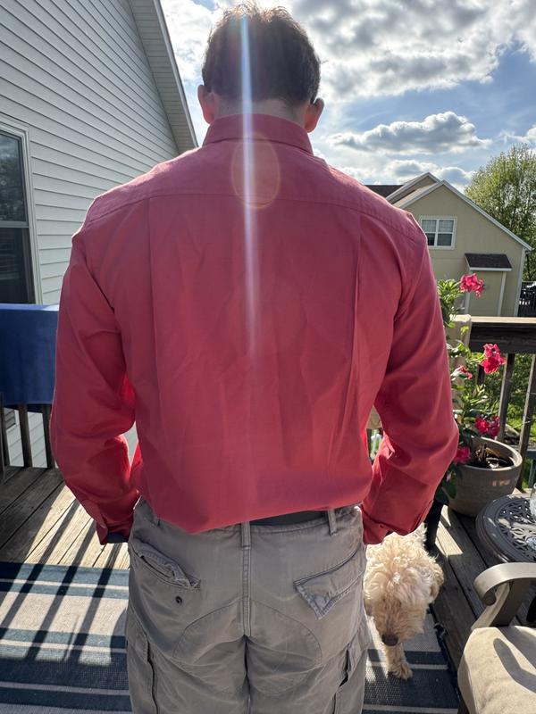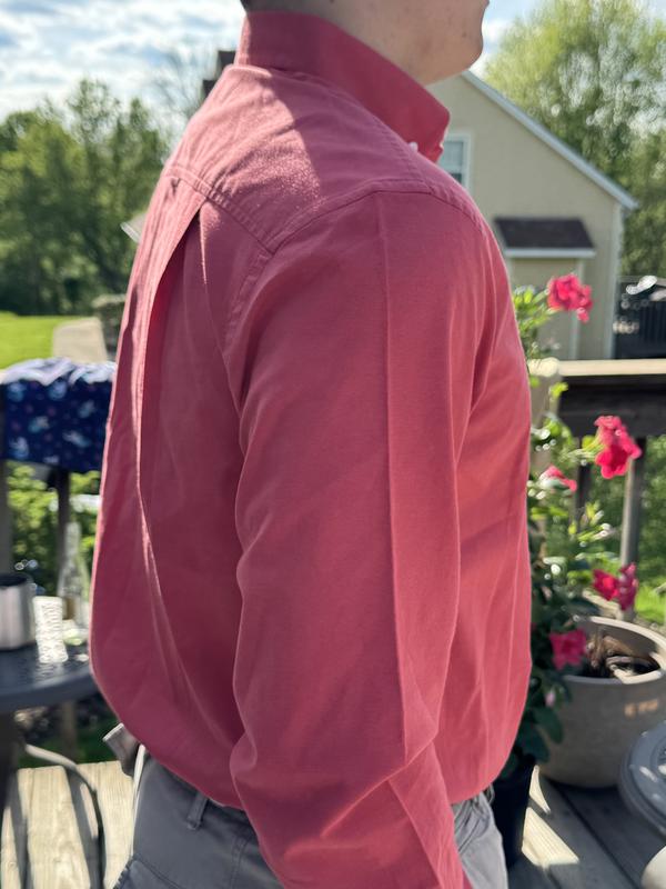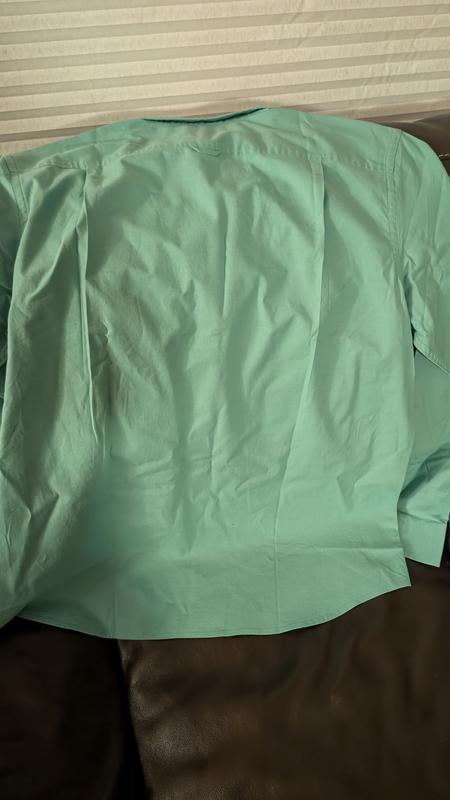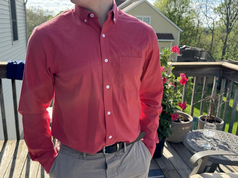 Love the color and material of the shirt.