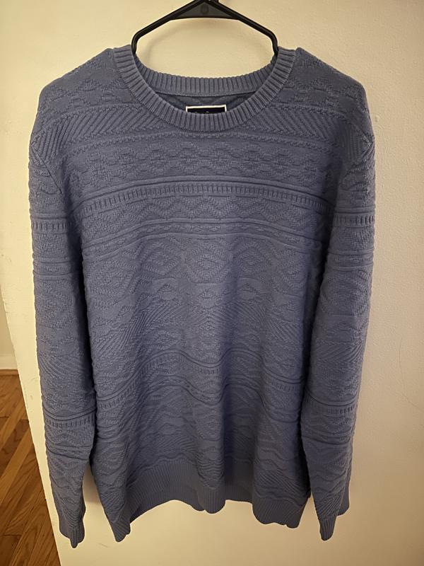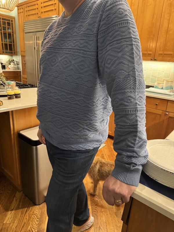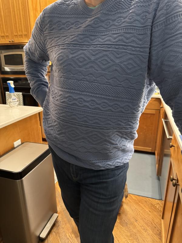 My husband loves the texture and fit of this sweater. Fairly heavy/thick but still soft and hangs just right. Not at all itchy. Looks great with or without collared shirt underneath. The blue has a hint of gray. Just lovely.