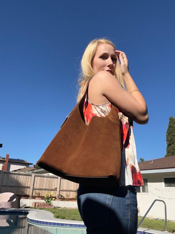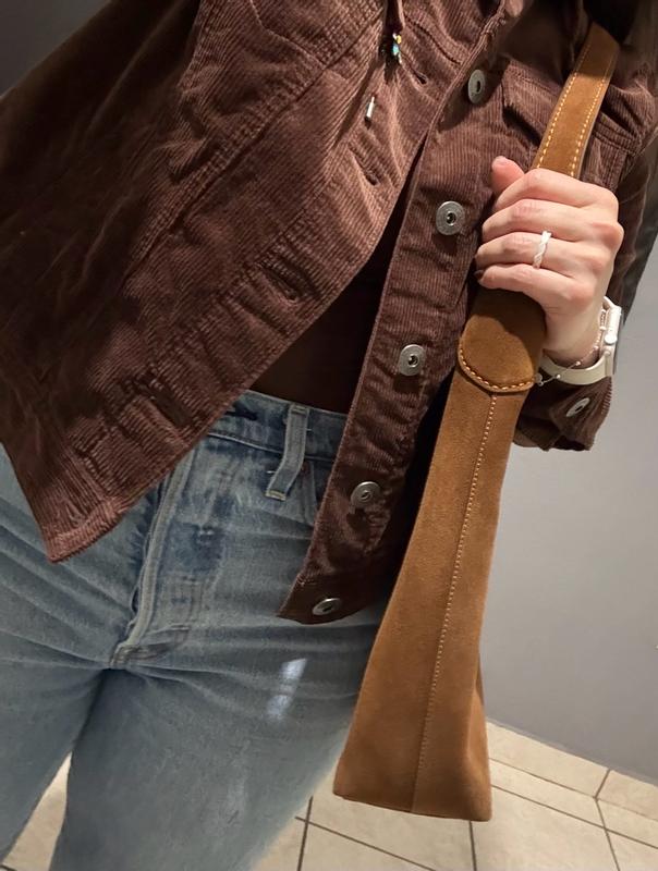 GORGEOUS BAG! Super soft suede in a beautiful brown color. Perfect length strap for shoulder or arm use. Large interior fits all your necessities and then some! Snap button closure helps to keep contents inside. Great craftsmanship. Thank you Influenster!