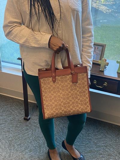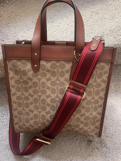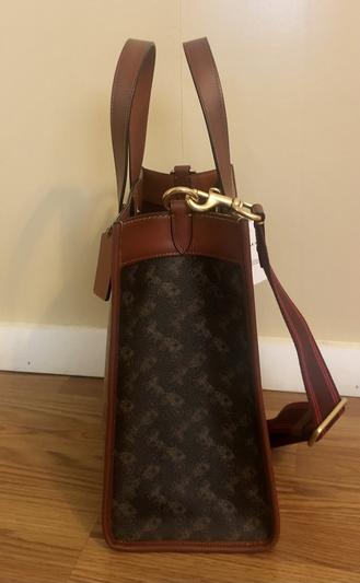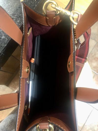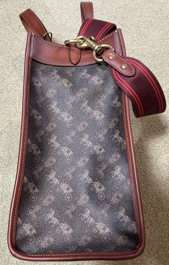I love the signature logo on the front and back with the carriage design on the sides. The inside is a beautiful burgundy suede. The tote is big enough to hold my laptop but not too big to be worn as an everyday bag. There is only one inside zipper compartment. I would have given it 5 stars but wish it had more compartments inside