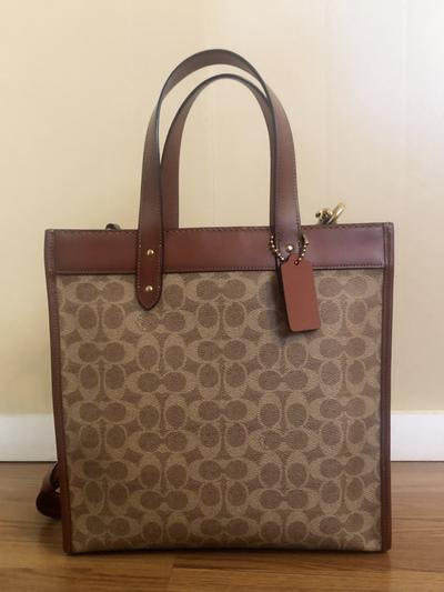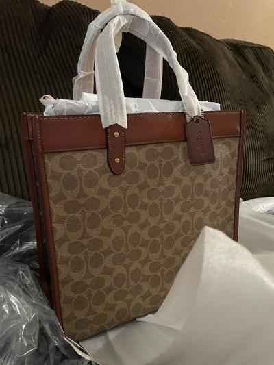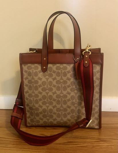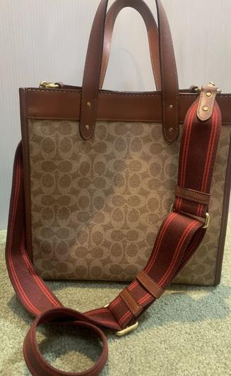 The Coach Tote was exactly as described in the details, Love the Color, and Size too! Product is medium to light weight.
