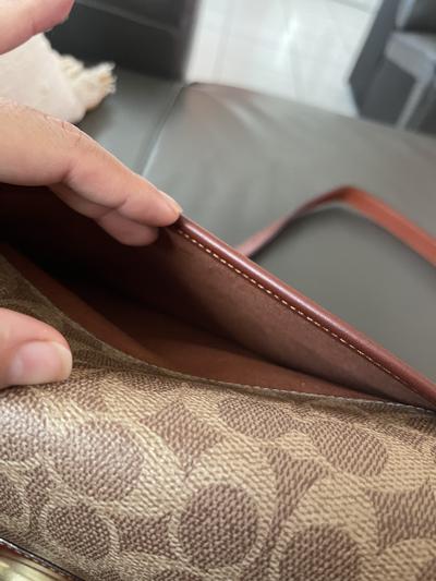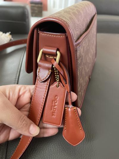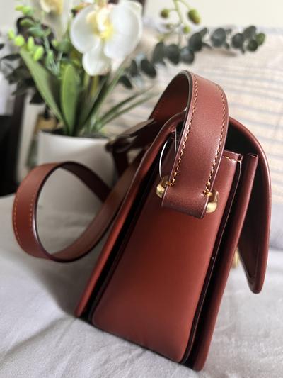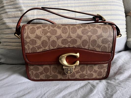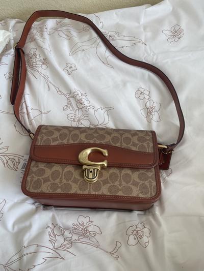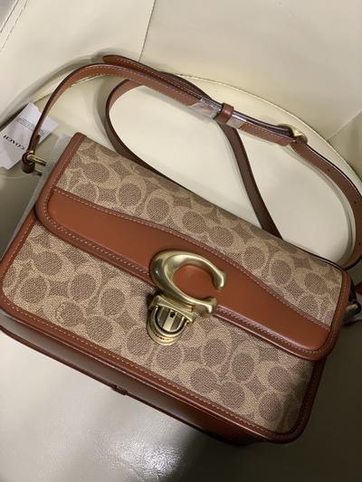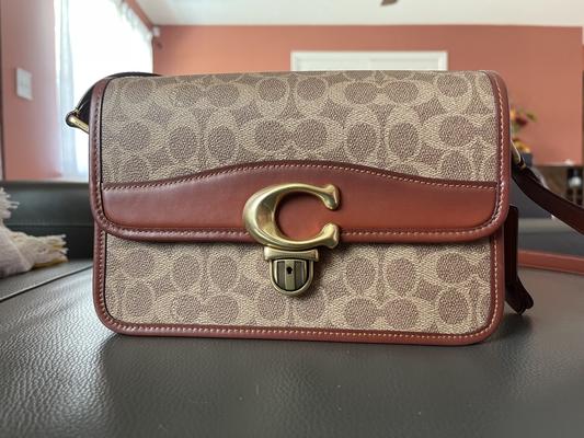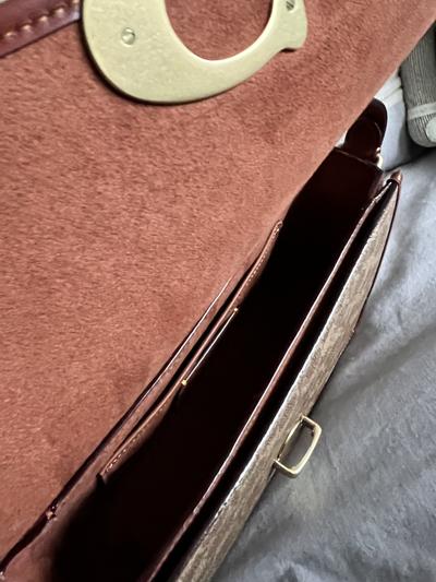 This is a beautiful purse and the perfect size. I had been carrying larger bags but wanted a smaller size and was having trouble finding one that wasn’t too small. This purse is a great in between size. Room enough for wallet, phone, small brush, make up etc. The quality is wonderful. Beautiful leather trim, soft suede inside and the coated canvas outside cleans easily. The color is exactly as pictured online. The leather strap is adjustable with several length choices which is nice for any height. It comes with a dust bag too. It is very well made and with its classic style I will use it for years to come. My favorite accents are the push button clasp and the large side pocket. The clasp can be locked with a key that was included. Easy to open for me yet secure if I want it to be. The thin side pocket is wide enough to slide my phone into, grab out quickly and hold it securely. I’m very happy with this choice!