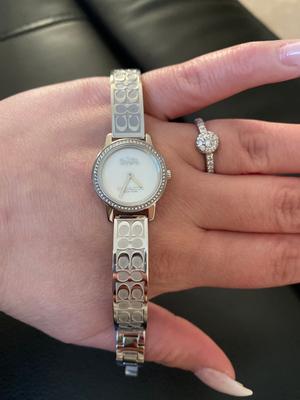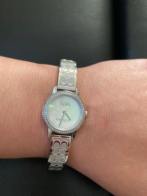 Web ID: 10566689A sophisticated minimalist design, the Audrey is a refined bracelet watch perfect for day and evening. Finished with a COACH Signature bangle, this stainless steel design features a white mother-of-pearl dial and sparkling crystal-encrusted bezel.