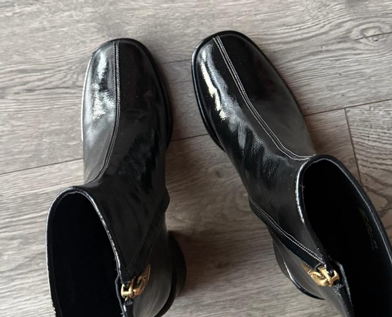 I half-sized up and got a 6.5. They are true to size, but I plan to wear them with thicker socks during the colder months. These booties are super cute and chic, with no discomfort - you can wear them right out of the box. Some people mention the leather being very shiny and looking a bit fake, but the shine is actually glazed leather which in part serves as a protective coating (but not making them waterproof). Wearing exposed leather in rain and snow will cause it to deteriorate quickly. I plan to style them with jeans and black leggings, so the finish works well as a statement piece. The leather is also easy to clean. I love them! 😍