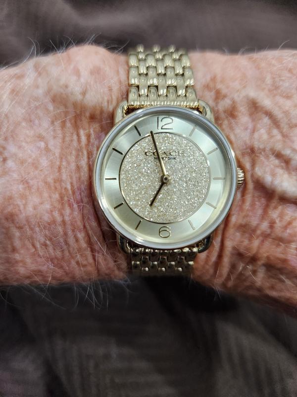 With clean lines and a modern minimalist sensibility, the Elliot is a true design classic ready for workdays and weekends. This gold tone round bracelet watch features a gold dial detailed with a mix of numerical and stick makers on a glittery diamond-dusted track for a touch of shimmer. Style 14504374