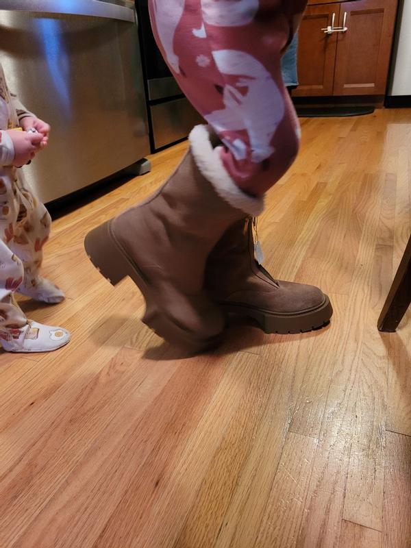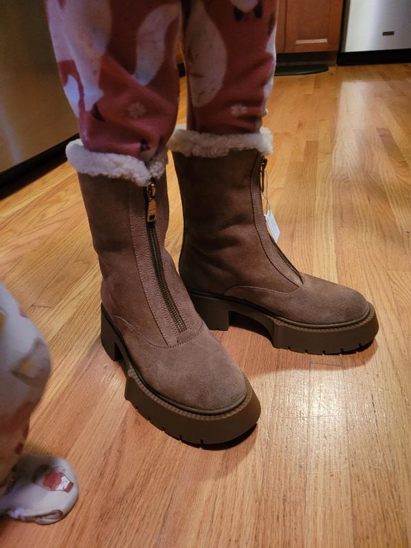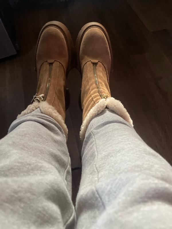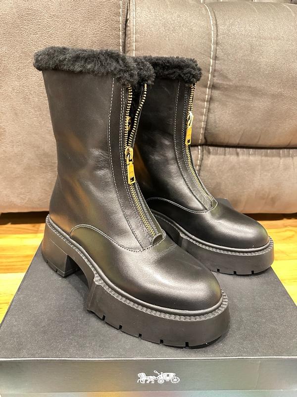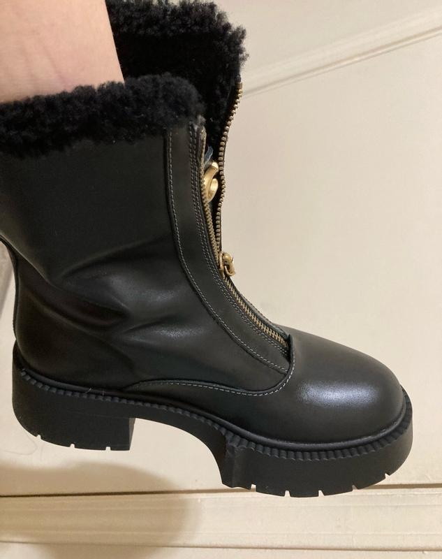 These boots look stylish and functional, perfect for colder weather. The smooth black leather paired with the chunky sole gives them a modern, edgy vibe, while the soft shearling lining at the top adds warmth and comfort. The front zipper with gold hardware stands out as a practical and fashionable detail. Overall, they seem well-made, sturdy, and versatile enough to dress up or down—great for someone who wants both style and durability in a winter boot.
