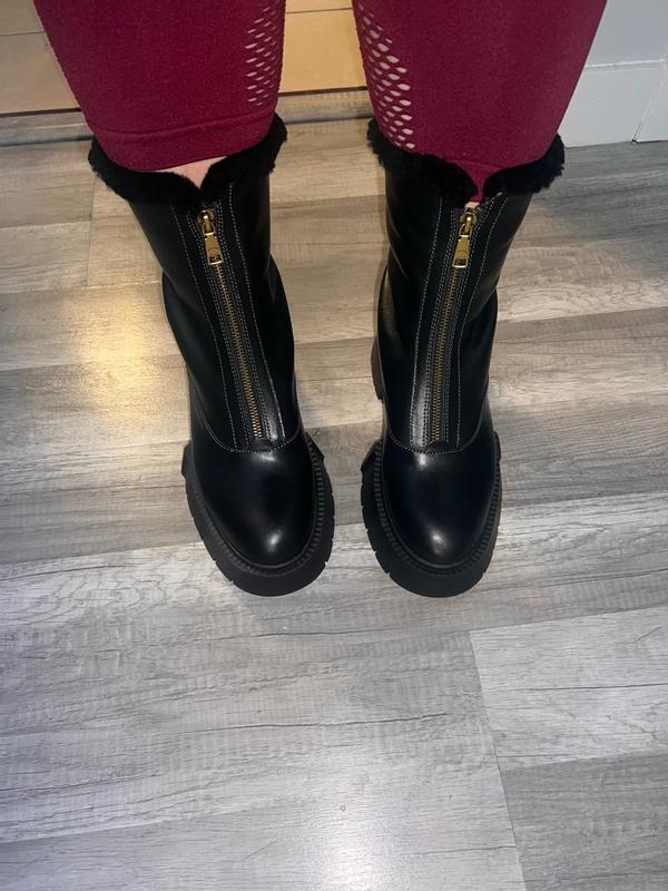 These are such nice boots! I am positive these are the nicest pair in my collection so far. I really appreciate the transparency of the sourcing for their fabrics like the wool and leather. As far as fit goes, they are comfortable and not too snug. I don't feel pinching or squeezing while walking in them. There is no squeaking from them when I walk on certain flooring. I have yet to slip! Though I haven't walked in ice or snow. I am in love with the style and look of these boots. They can be unzipped and folded down or zipped all of the way up for maximum security while outside. The platform type is so stylish and in right now! The leather is not super sheen or shiny and I adore the gold zipper and emblem on them. These boots are fabulous and will be getting many wears from me. The wool is quality and soft, warming. I will say, the heel part is a little big for me but it's not uncommon with boots; comes with the territory I suppose. I can tell by the feel, the look, the weight, and the SMELL - that these are the real deal. I love when brands listen to us about quality concerns, if you get what you pay for it must certainly be something durable and these boots are IT.
