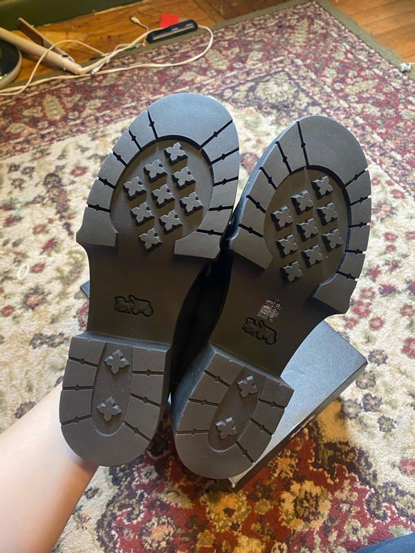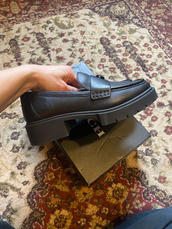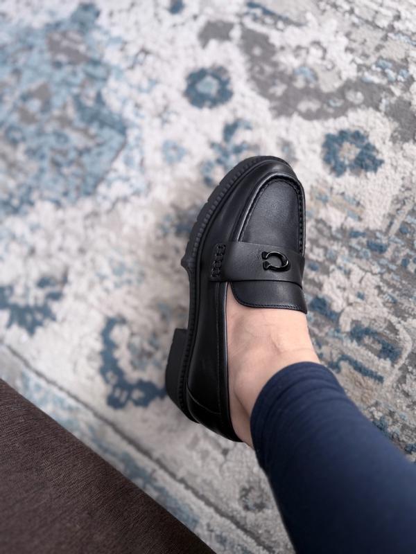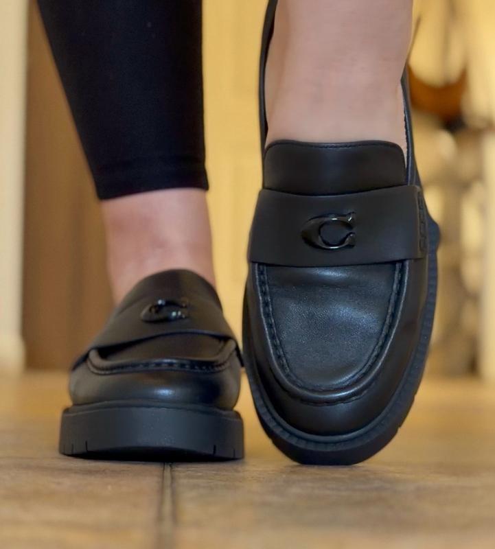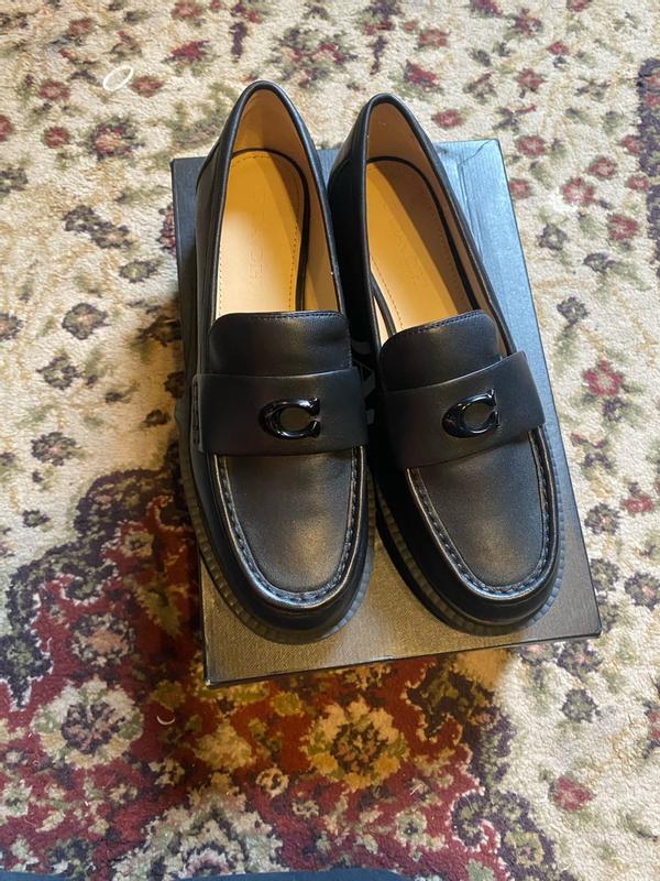 The Leah loafers are of great quality leather and style. The shoes are a very matte black, but could also pass as a rich deep charcoal brown or mushroom. The Coach logo is the same color as the shoe so the loafers could be worn with gold or silver accessories. The lug soles are substantial and sturdy. I tried the size 9, as a 9.5 was not available. The size 9 was a bit tight so I returned them. Had they fit, I might have kept them, although I prefer a shinier leather.