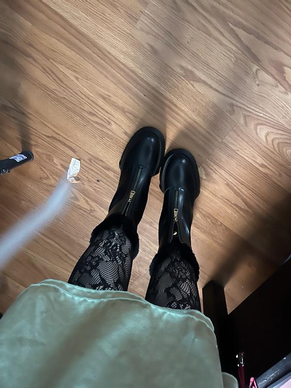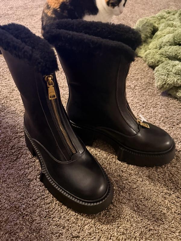 These boots look stylish and functional, perfect for colder weather. The smooth black leather paired with the chunky sole gives them a modern, edgy vibe, while the soft shearling lining at the top adds warmth and comfort. The front zipper with gold hardware stands out as a practical and fashionable detail. Overall, they seem well-made, sturdy, and versatile enough to dress up or down—great for someone who wants both style and durability in a winter boot.