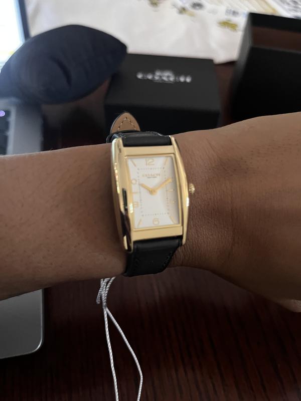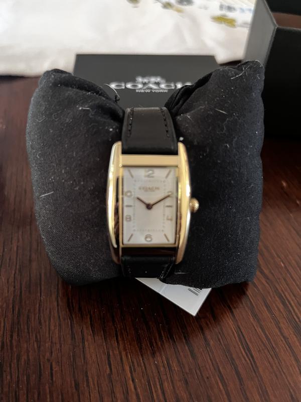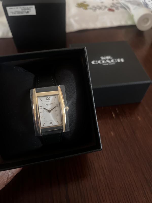 My watch arrived today and I couldn't be happier. It is in an impressive presentation box should you be gifting the watch. It looks as good in person as it does online. It fits my wrist perfectly and the watch face is large enough to easily read but not overpowering in size. The black leather band is of superior quality (well, it is Coach!) with plenty of holes to accommodate most any size wrist. Instructions for use and warranty must be accessed online.